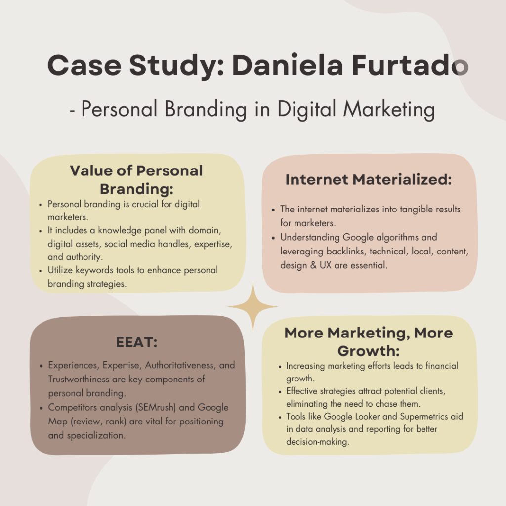One key takeaway from this semester is the importance of personal branding in establishing credibility and attracting potential clients. Daniela Furtado’s company serves as a great example of how personal branding can elevate one’s career. By focusing on building a strong personal brand and showcasing expertise through digital assets, social media, and authoritative publications, professionals can position themselves as industry leaders and attract lucrative opportunities.